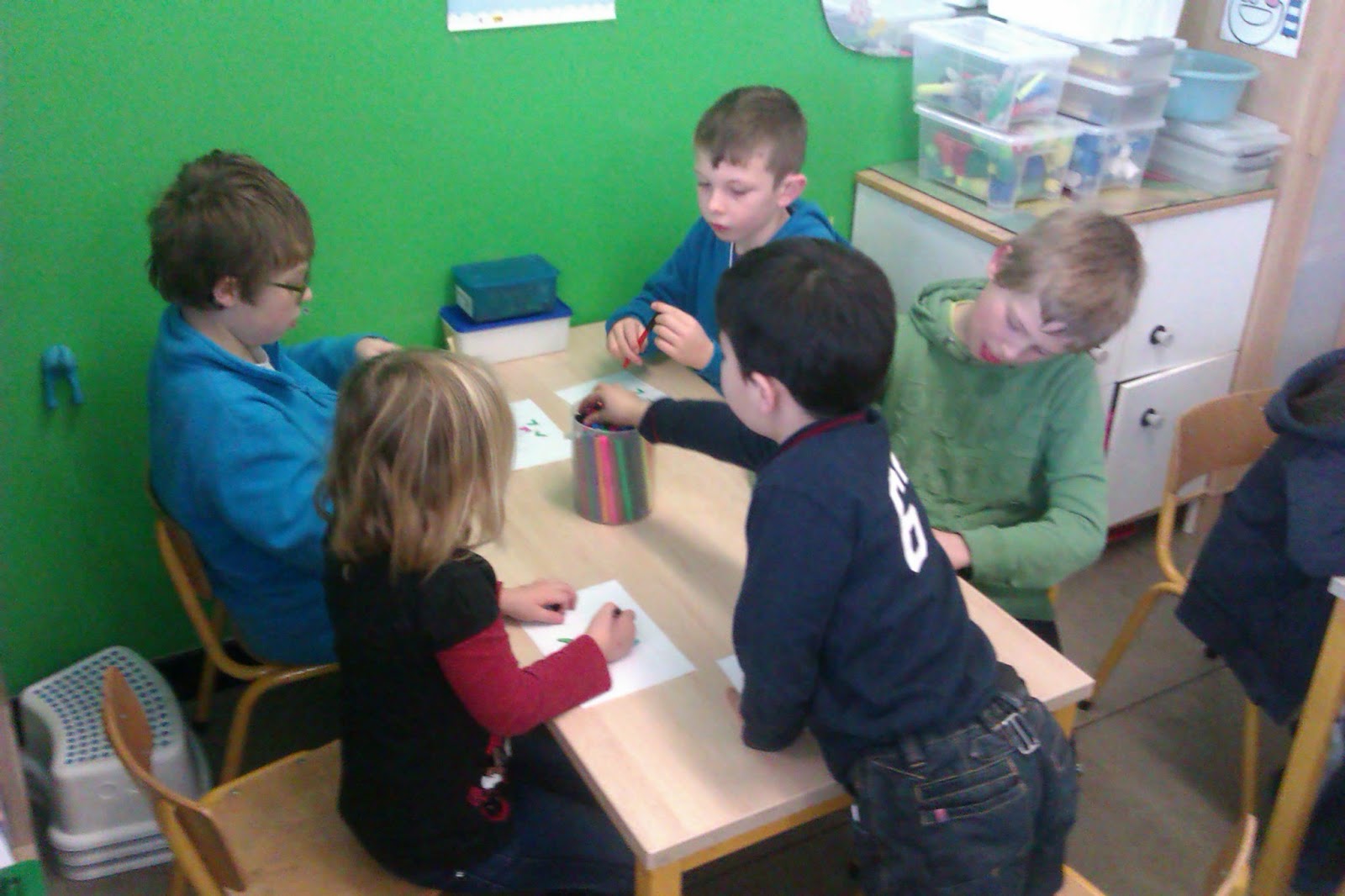 Namiddag hadden we schoolatelier. We moesten een kleurtje trekken en zo wisten we in welke klas we moesten gaan zitten.