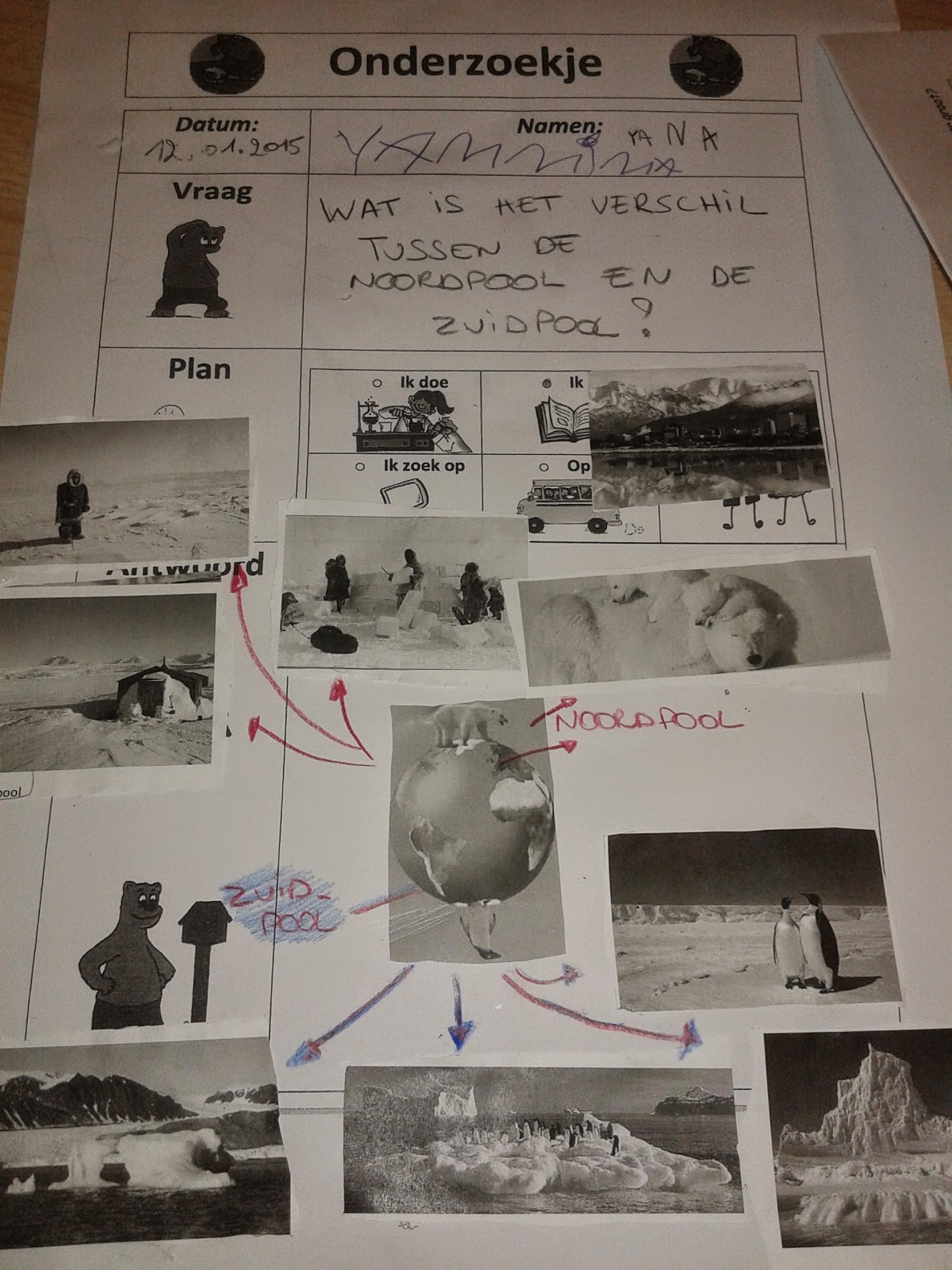 Het was ook nog onderzoekstijd vandaag. Jade en Jasmijn onderzochten welke dieren er op de Noordpool wonen en welke dieren er op de Zuidpool wonen. En Yannina en Yana onderzochten wat het verschil was tussen de Noordpool en de Zuidpool.