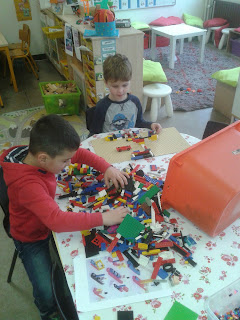 Ondertussen kon je in de blokkenhoek boten maken, in de legohoek lagen stappenplannen om een boot te maken, je kon tekeningen maken van boten op echt 'botenpapier', je kon bootjes plooien van papier via een stappenplan en je kon bootjes maken met strijkparels. Je kon ook gaan knutselen : je moest daarvoor wel samenwerken met iemand. Samen met je vriendje mocht je een doos gaan kiezen en er met kosteloos materiaal een mooie boot van maken.