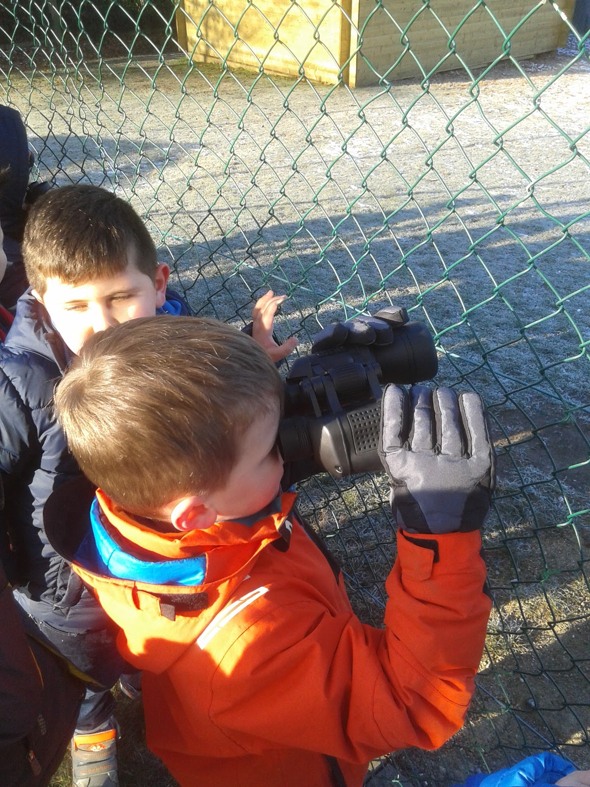 Na het eetmoment en de kleine speeltijd zijn we terug naar buiten geweest om vogelzaad te strooien en vetbollen op te hangen. Daarna gingen we op pas met onze verrekijkers. We gingen aan de andere kant van de school achter de draad staan en dan was het wachten en kijken. Spannend!! Het was ook niet zo simpel om iets te zien door die verrekijkers :)
